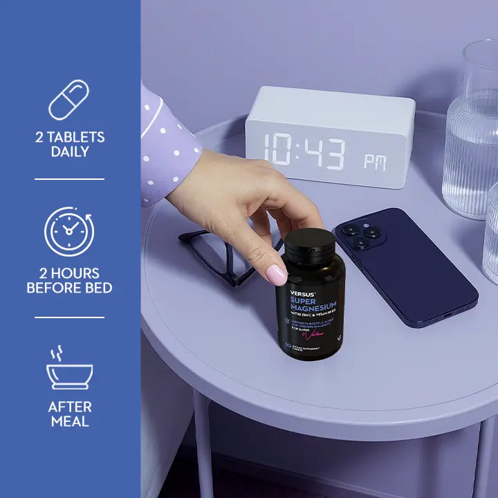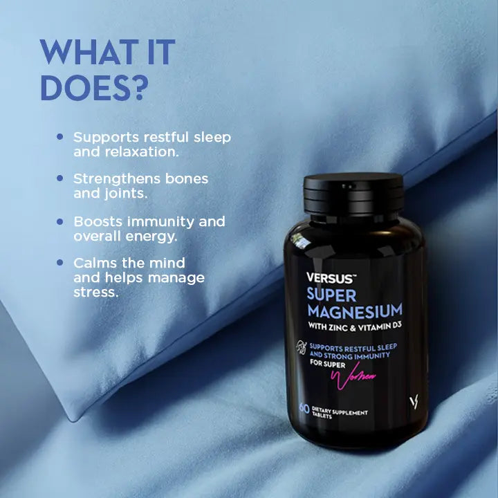 Super Magnesium is formulated with highly absorbable Magnesium Bisglycinate, which is gentle on the stomach and effective for restoring balance. It supports restful sleep, reduces stress, and keeps energy steady throughout the day.