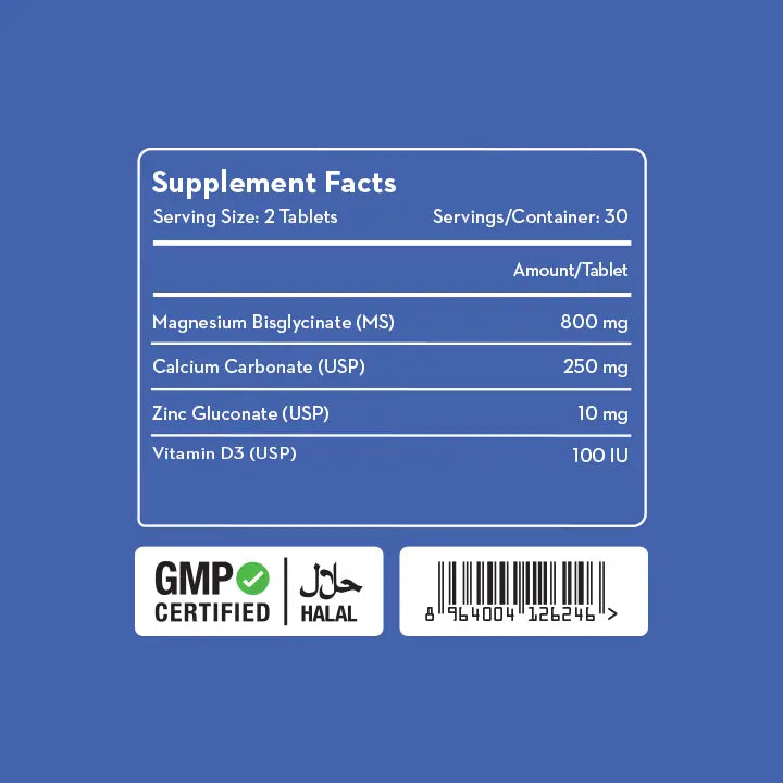 Each serving of Super Magnesium (2 tablets) provides about 225–250 mg of elemental magnesium, the form your body actually uses. The rest of the compound is glycine, an amino acid that improves absorption and also supports calmness and sleep. This is within the recommended dose.